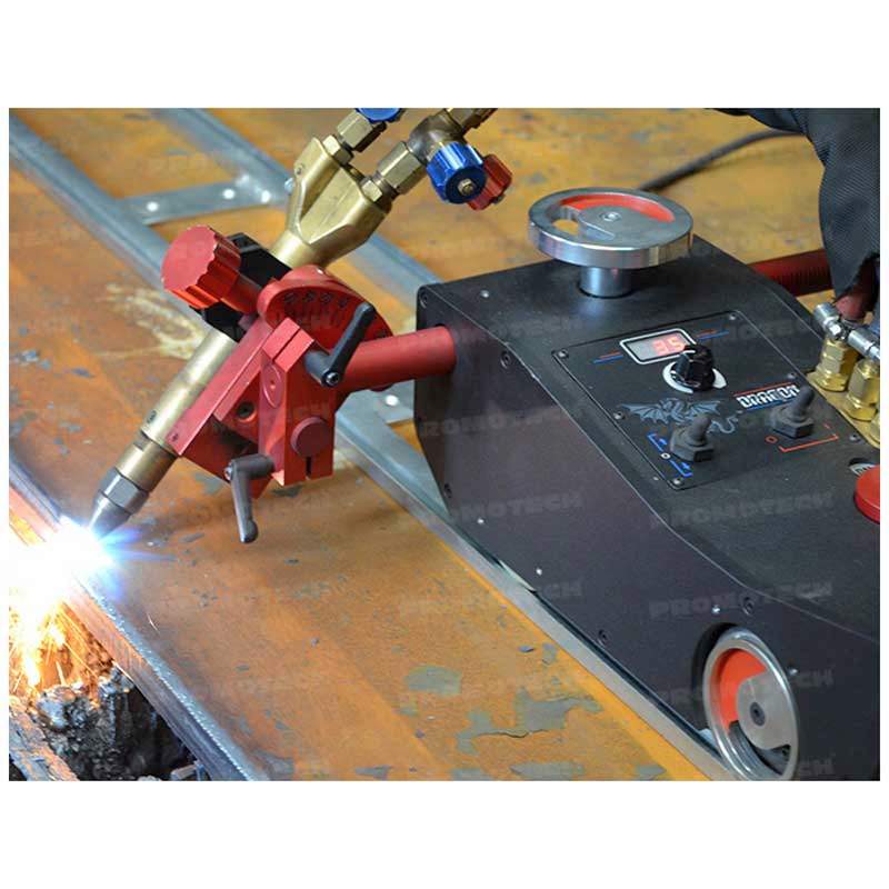 Tractorul Dragon HS se foloseste pentru operatiuni de debitare si sanfrenare direct pe suprafata obiectului sau montat pe cale de rulare metalica. Debitarea se poate face in unghiuri confortabile si grele (reduse pana la 45°). Utilizatorul are posibilitatea de a indeplini aceleasi functii si in paralel prin utilizarea a 2 pistolete.